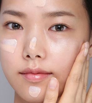 おでこ、鼻、両頬、あごの5点に、パール粒くらいの下地を乗せ、手で優しく伸ばしていきましょう。