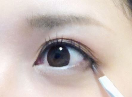次に、少し暗めのブラウンをとり、目の際にまっすぐ入れていきましょう。