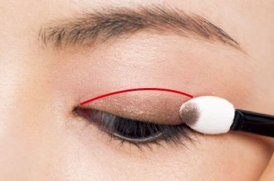 まずはアイホール全体に明るいハイライトを入れ、明るめのブラウンを二重幅の少し上まで丸く入れていきます。