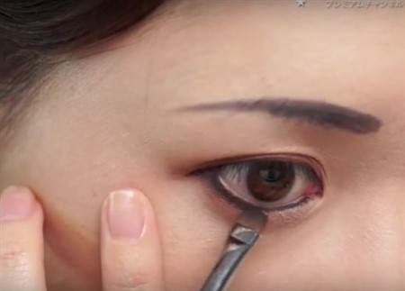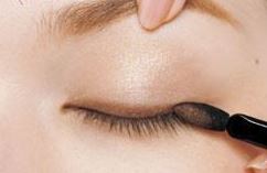 次に、まぶたを指で優しく持ち上げながら、目のキワに濃いめのブラウンまたはブラックのアイシャドウでラインを入れていきます。
