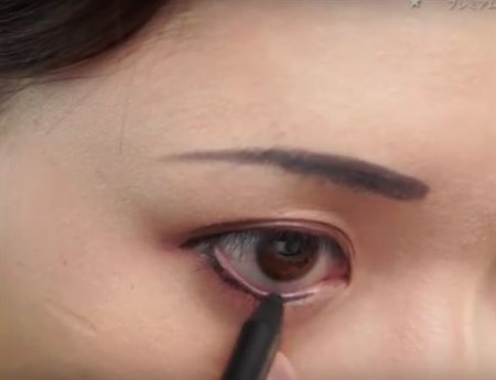 下まぶたにも軽くアイシャドウを塗り、ブラックのペンシルライナーで囲みアイラインを描いていきましょう。