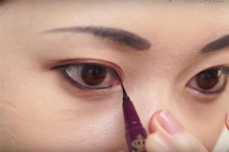 インラインを引いたら、次はブラックのリキッドライナーを使って少しタレ目になるように目尻を下げてラインを引いていきます。