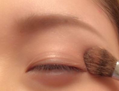 まずは大きめのブラシで、ブラウンよりのハイライトをアイホール全体にのせ、明るめのブラウンを目尻多めにのせていきます。