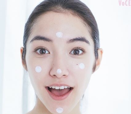 おでこ、鼻、両頬、顎の5点に下地をおき、手で優しく馴染ませていくのがポイント。
