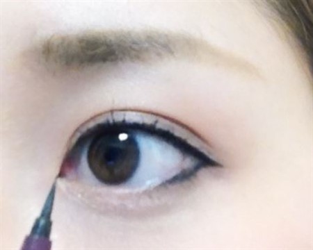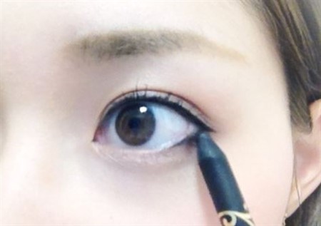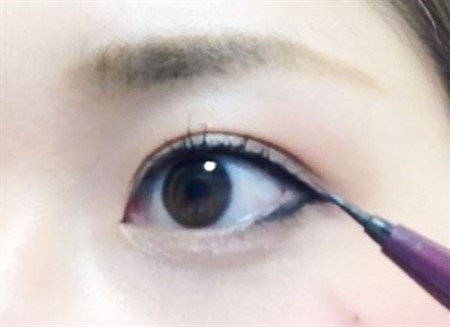 アイシャドウのあとは、ブラックのリキッドアイライナーでラインを引いていきます。