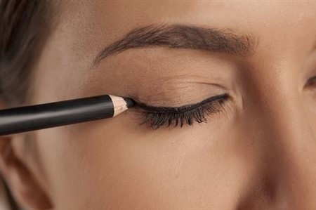 まずはブラックのペンシルアイライナーを使って上まぶたの全体にラインを引き、目を全体的に大きく見せます。